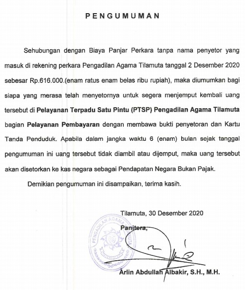 Biaya yang nyasar ke rekening perkara Pengadilan Agama Tilamuta